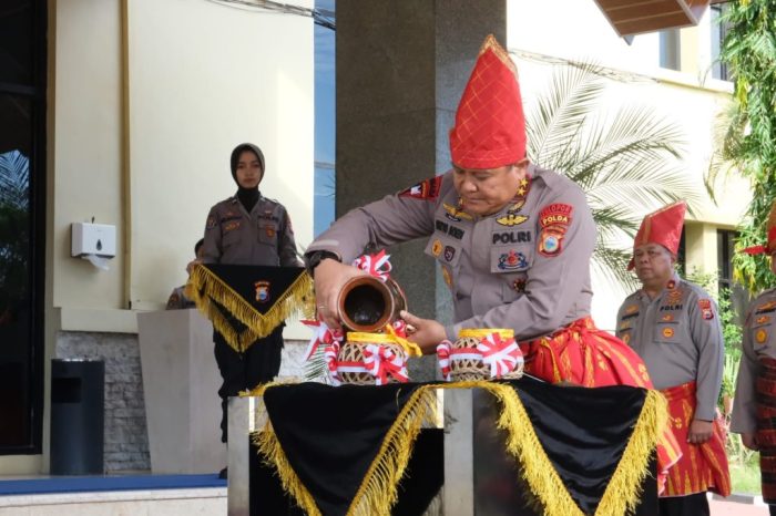 Acara tradisi penyerahan air suci dipimpin langsung oleh Kapolda Sulawesi Selatan Irjen Pol. Drs. Setyo Boedi Moempoeni Harso.,SH.,M.Hum di Mapolda Sulsel pada Rabu, (14/6/2023). Untuk proses pengambilan air suci dilakukan personil Sat Brimob Polda Sulsel.