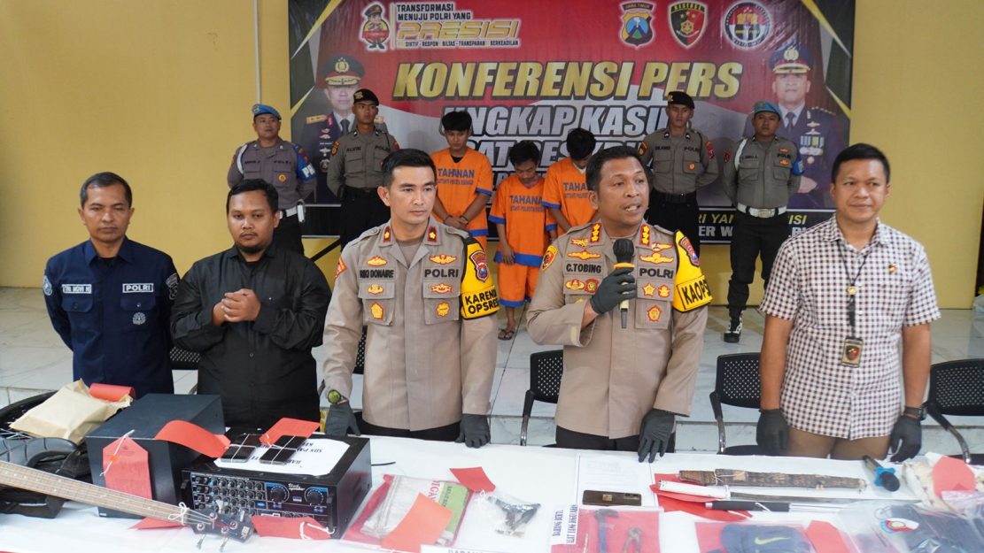 Disampaikan Kapolresta Sidoarjo Kombes. Pol. Christian Tobing dalam konferensi pers, Selasa (6/2/2024) di Mako Polresta Sidoarjo. Atas peristiwa kekerasan terhadap orang melibatkan oknum perguruan silat yang terjadi di wilayah hukumnya di Januari 2024 tersebut, polisi berhasil mengungkap kasus di lima lokasi dengan tersangka tiga dewasa dan empat anak di bawah umur.