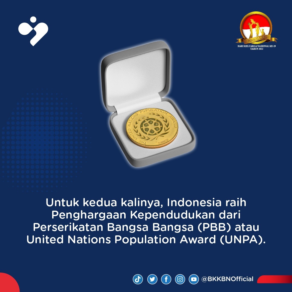 Penghargaan ini juga merupakan pengakuan Internasional atas kontribusi luar biasa BKKBN dalam meningkatkan kesadaran dan merancang solusi untuk masalah kependudukan.