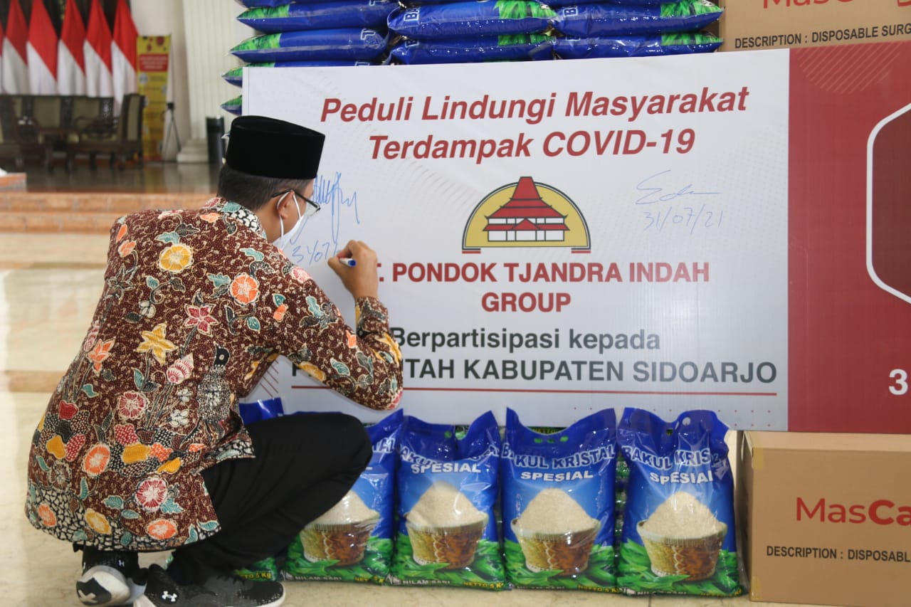 “Pada awal pandemi, yaitu April 2020 telah berpartisipasi memberikan bantuan sembako beras 5 Kg sebanyak 8.000 sak dan sekarang kami kembali menyerahkan bantuan berupa Sembako Beras 5Kg sebanyak 5.000 Sak dan Masker sebanyak 1.000 Kotak kepada pemkab Sidoarjo,” terang Edward Sugiharto, Direktur PT. Pondok Tjandra Indah Group.