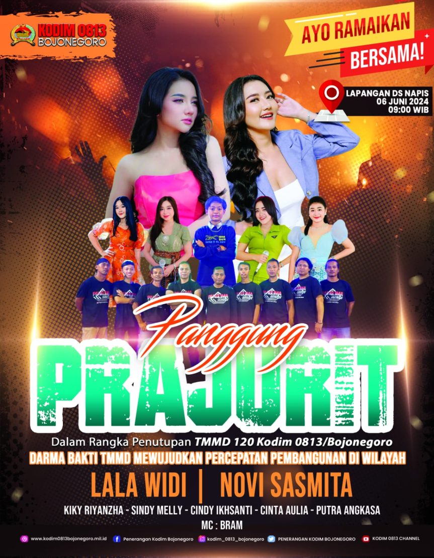 Rangkaian acara penutupan kegiatan program TNI Manunggal Membangun Desa atau TMMD ke- 120 tahun 2024 diwilayah Kabupaten Bojonegoro bakal diramaikan dengan digelarnya ‘Panggung Prajurit’ yang menghadirkan sejumlah artis Ibu Kota Jawa Timur, seperti Lala Widi, Novi Sasmita, Kiki Riyanzha, Sindhy Melly, Putra Angkasa dan lainya.