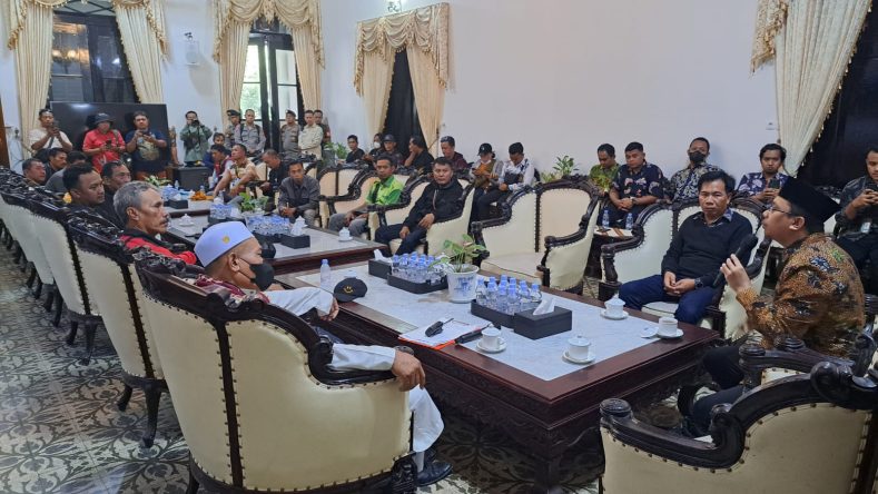 Bupati Sidoarjo Ahmad Muhdlor yang menemui sejumlah perwakilan paguyuban TSPT mendengarkan satu persatu keluhan yang disampaikan para pengelola sampah. Kesimpulan dari pertemuan itu para pengelola sampah yang ada di TPST/TPS 3R merasa keberatan dengan penetapan tarif. Selasa (16/5/2023) di Pendopo Delta Wibawa.