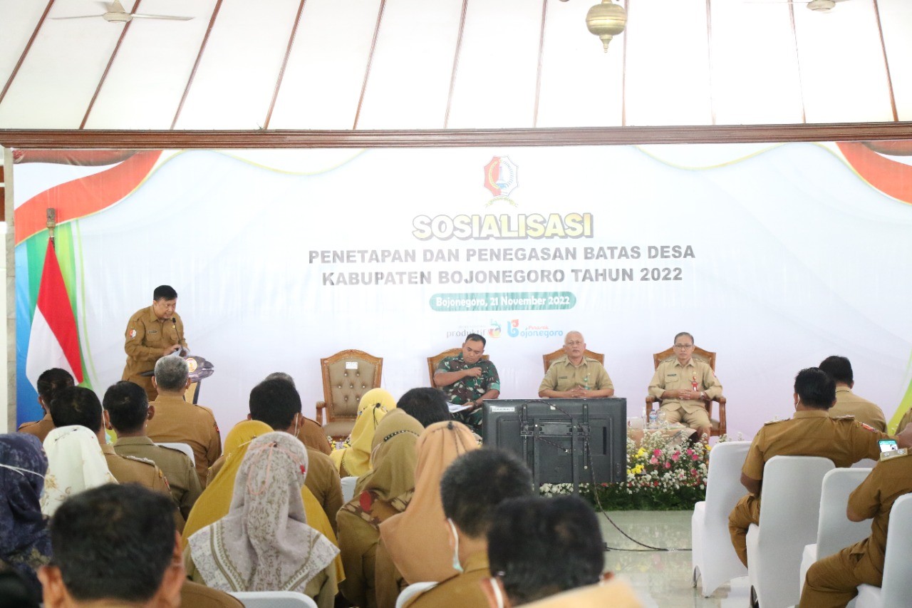 Pemkab Bojonegoro melalui Dinas Pemberdayaan Masyarakat dan Desa (PMD) menggelar sosialisasi penetapan dan penegasan batas desa. Acara yang digelar di Pendopo Malowopati Senin (21/11/2022) ini diharapkan dapat mempermudah rencana pembangunan desa.
