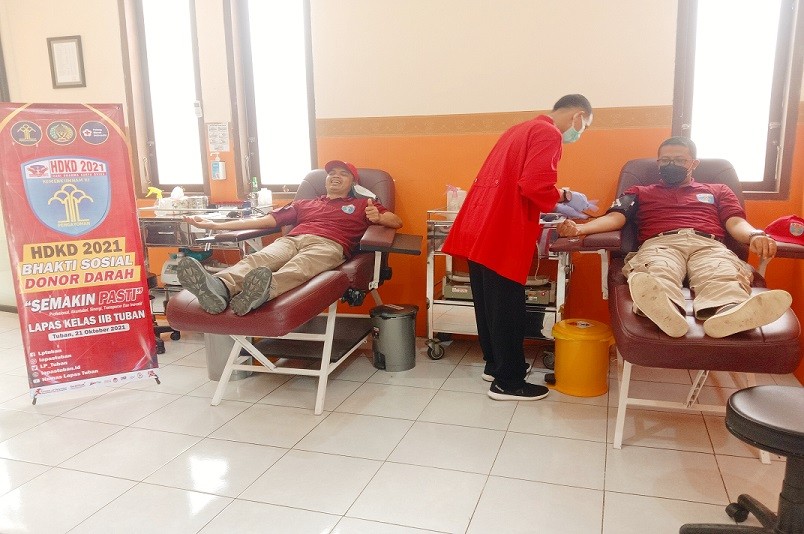 Dalam rangka memperingati Hari Dharma Karya Dhika 2021, Lapas kelas IIB Tuban menggelar bakti sosial dan donor darah, Kamis (21/10).