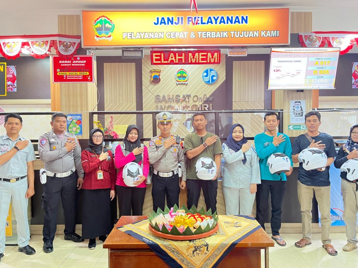 Sebagai bagian dari kegiatan ini, Satlantas Polres Wonogiri juga memberikan edukasi dan sosialisasi tentang keselamatan berlalu lintas. Sebanyak 15 helm SNI dibagikan secara cuma-cuma kepada wajib pajak yang sedang mengurus administrasi di Samsat. Selain itu, snack juga dibagikan untuk menambah kehangatan suasana.