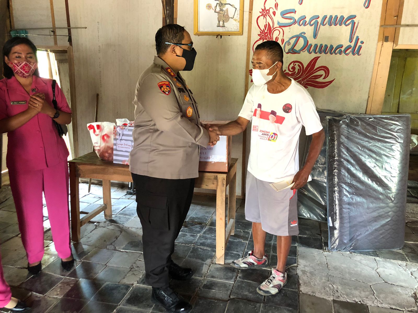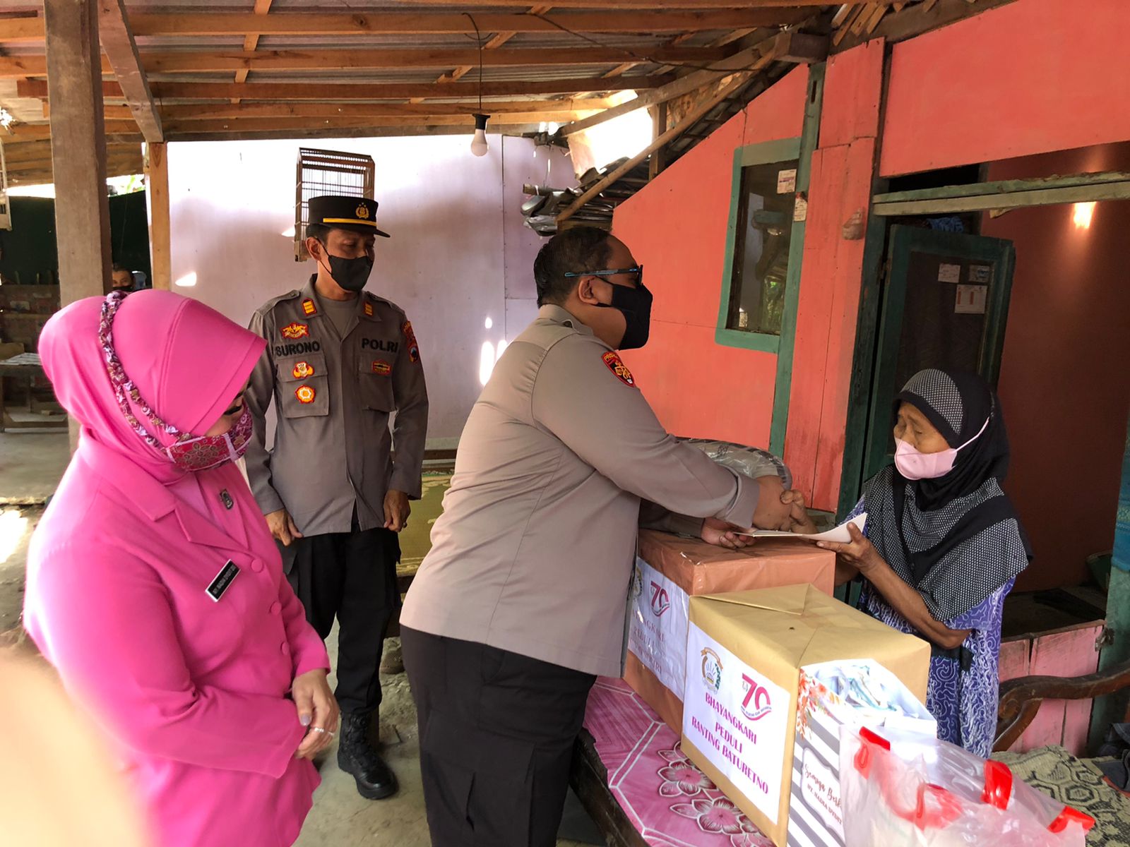 Kapolres menjelaskan penerima bantuan itu diantaranya Dibyo Wiyono Narno (62) alamat Dusun Dusun Belikrejo Rt. 02/09, Desa Gambiranom, Tukiman (78) alamat Dusun Batu Lor Rt. 02/18, Desa Baturetno dan Puji Isnani (37) alamat Dusun Semanding Rt. 03/01, Desa Sendangrejo.