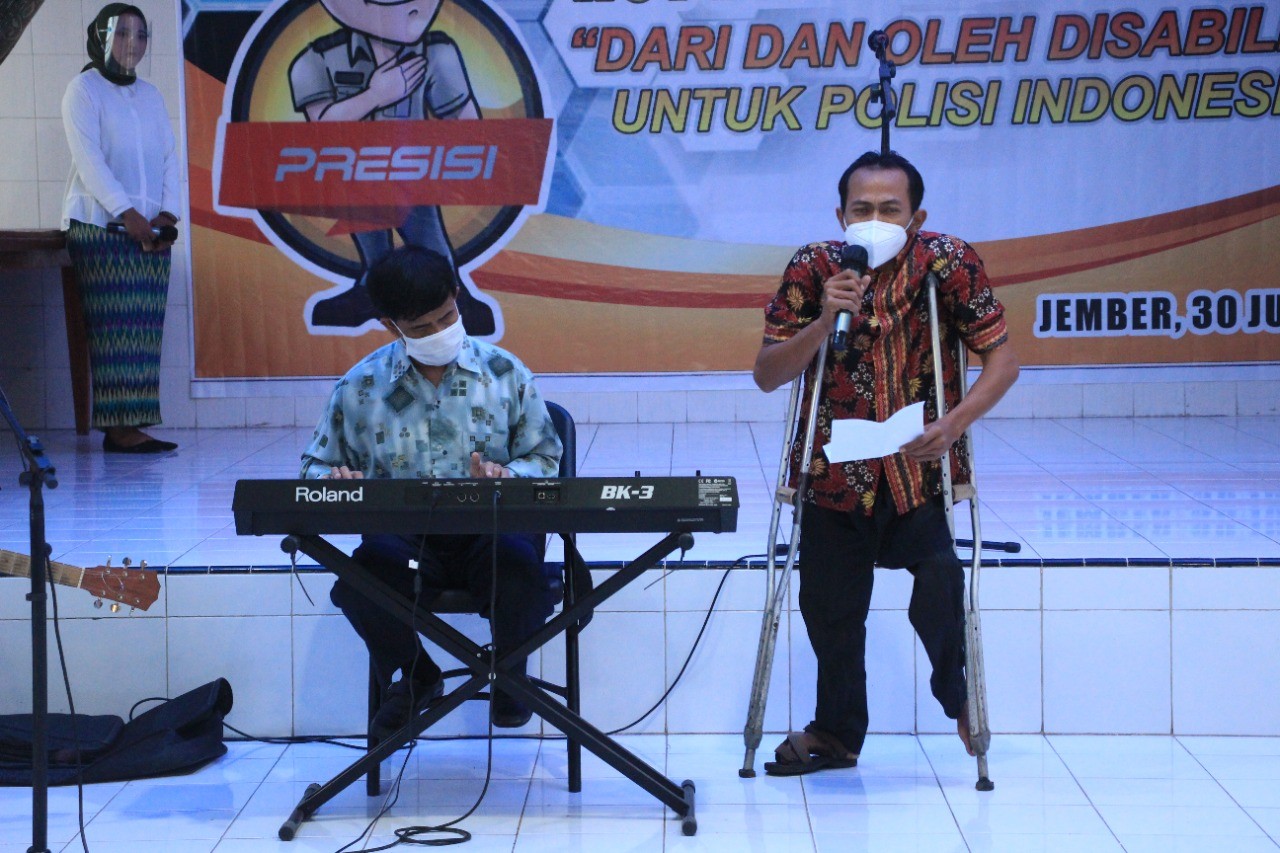 Sementara itu Perwakilan Disabilitas, Asrorul Mais menyampaikan, kegiatan ini adalah kesempatan luar biasa yang diberikan kepada disabilitas untuk mempersembahkan karya terbaik kepada Polisi Indonesia. “Seluruh pengisi acara dan talent dalam rangkaian acara peringatan HUT Bhayangkara ke 75 yang digelar kali ini berasal dari disabilitas.” terangnya.
