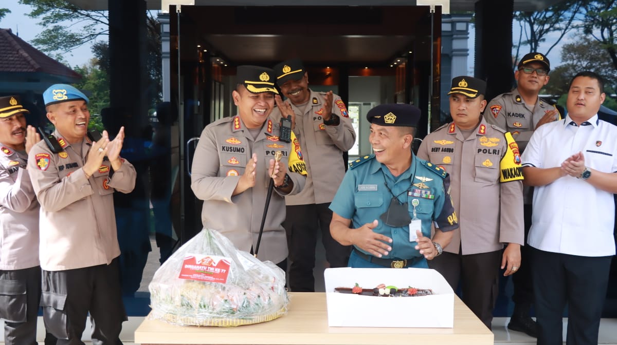 Jajaran TNI menyambut hangat kedatangan Kapolresta Sidoarjo beserta rombongan. Seperti diutarakan, Komandan Brigif 2 Marinir Kolonel Mar. I Gede Edy Supriyadi, mengucapkan apresiasi atas kejutan di HUT TNI ke-77, serta berharap semakin mensolidkan sinergitas TNI-Polri dalam menjaga kondusifitas kamtibmas di wilayah Kabupaten Sidoarjo dan tentunya keutuhan NKRI. (Ags/MW)