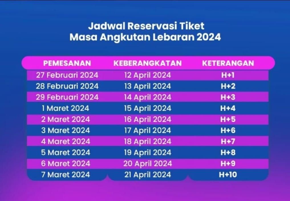 PT Kereta Api Indonesia (Persero) membuka penjualan tiket kereta api pada periode angkutan Lebaran 2024 mulai tanggal 15 Februari 2024 atau H-45 untuk keberangkatan 31 Maret 2024 atau H-10 Lebaran. Tiket dapat dibeli melalui aplikasi Access by KAI, website kai.id, serta seluruh channel resmi pemesanan tiket KA lainnya.
