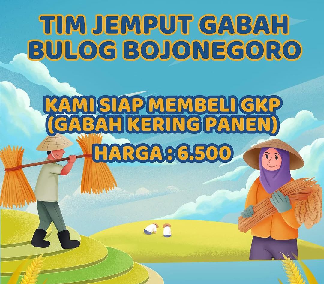 Perum Bulog Kantor Cabang Bojonegoro akan membeli gabah kering panen (GKP) petani dengan harga Rp 6.500. Salah satu programnya adalah jemput bola membeli langsung dari petani. Besaran harga ini sesuai dengan harga pembelian pemerintah (HPP). Pembelian GKP ini dilaksanakan berdasarkan keputusan Kepala Badan Pangan Nasional Republik Indonesia Nomor 14 tahun 2025.