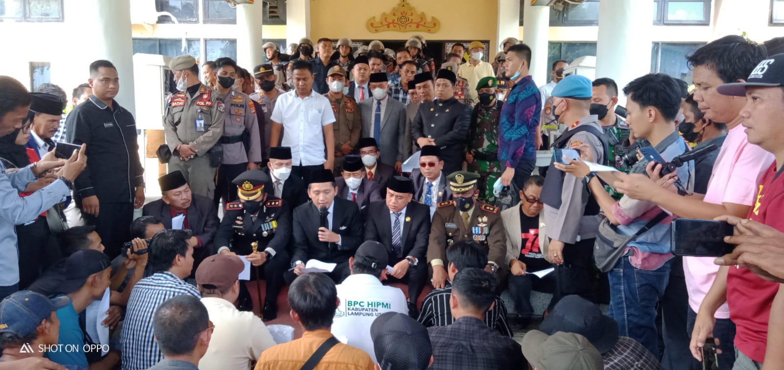 Pada pukul 11.30 WIB Wakil Bupati Lampura Ardian Saputra, beserta Wansori Ketua DPRD Lampung Utara ditemani Kapolres Lampura Kurniawan Ismail, Dandim 0412 LU Letkol Infantri Andi Sultan menemui masa aksi.