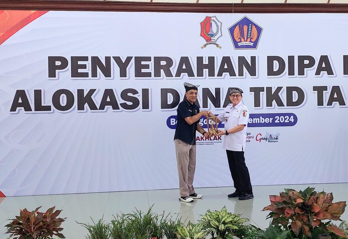 Pj Bupati Bojonegoro Adriyanto menerima Daftar Isian Pelaksana Anggaran (DIPA) dan Alokasi Dana Transfer ke Daerah (TKD) Tahun Anggaran 2025 dari Kepala Kantor Pelayanan Perbendaharaan Negara (KPPN) Bojonegoro. Penyerahan dokumen itu dilaksanakan Rabu (18/12/2024) di Pendopo Malowopati.