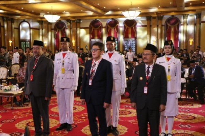 Pj Bupati Bojonegoro Adriyanto menerima Duplikat Bendera Pusaka dari Badan Pembinaan Ideologi Pancasila Republik Indonesia (BPIP RI) dalam acara Penyerahan Duplikat Bendera Pusaka kepada Bupati/Wali Kota Seluruh Indonesia dari Pemerintah Pusat untuk Pemerintah Daerah dan Perwakilan Republik Indonesia di luar Negeri serta lembaga lainnya, Selasa (6/8/2024) di Balai Samudra Jakarta Utara.