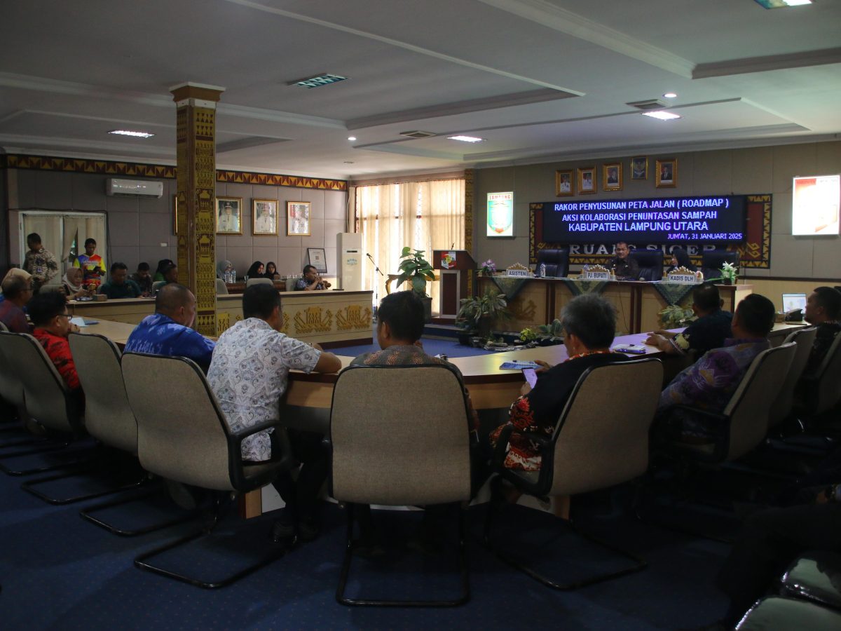 Penjabat (Pj.) Bupati Lampung Utara, Drs. H. Aswarodi, M.Si., memimpin Rapat Koordinasi (Rakor) Penyusunan Peta Jalan (Roadmap) Aksi Kolaborasi Penuntasan Sampah Kabupaten Lampung Utara, Jumat (31/1/2025). Rakor ini berlangsung di Ruang Siger, Kantor Pemkab Lampung Utara, dan dihadiri oleh berbagai pemangku kepentingan, Kepala OPD terkait, camat, serta perwakilan dari komunitas peduli lingkungan.