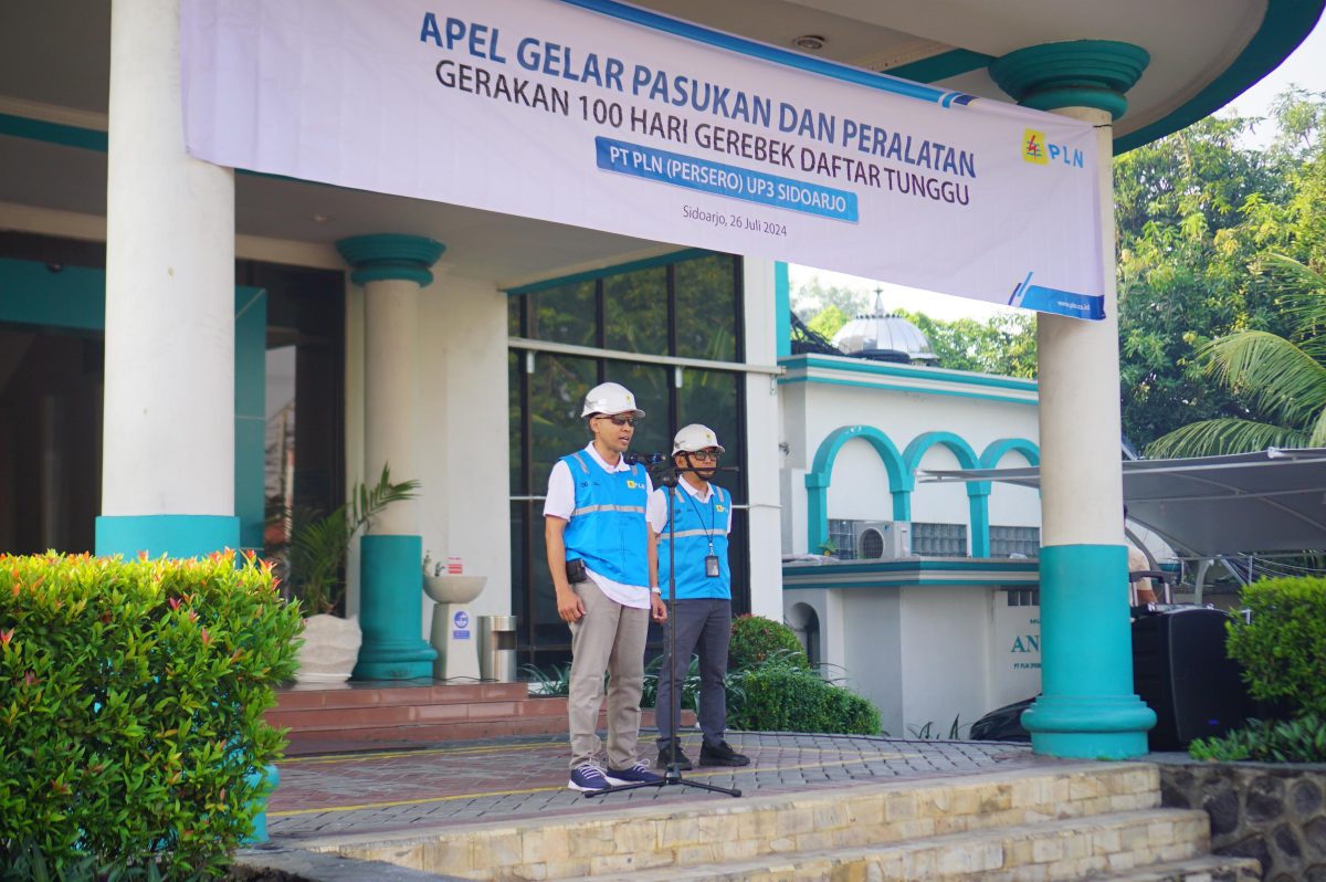 PLN Unit Pelaksana Pelayanan Pelanggan (UP3) Sidoarjo menggelar apel pasukan dan peralatan pagi ini untuk menandai dimulainya Gerakan 100 Hari Grebek Daftar Tunggu. (26/7/2024)