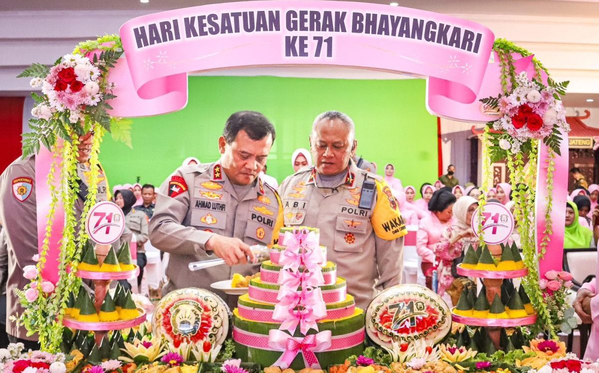 Polda Jateng memperingati Hari Kesatun Gerak Bhayangkari ke-71 dengan menggelar acara Tasyakuran di Gedung Borobudur, Mapolda Jateng pada Kamis, (19/10) pagi. Acara diikuti oleh seluruh pengurus Bhayangkari Cabang Jawa Tengah dan turut dihadiri Kapolda Jateng didampingi Waka Polda serta sejumlah PJU Polda Jateng.