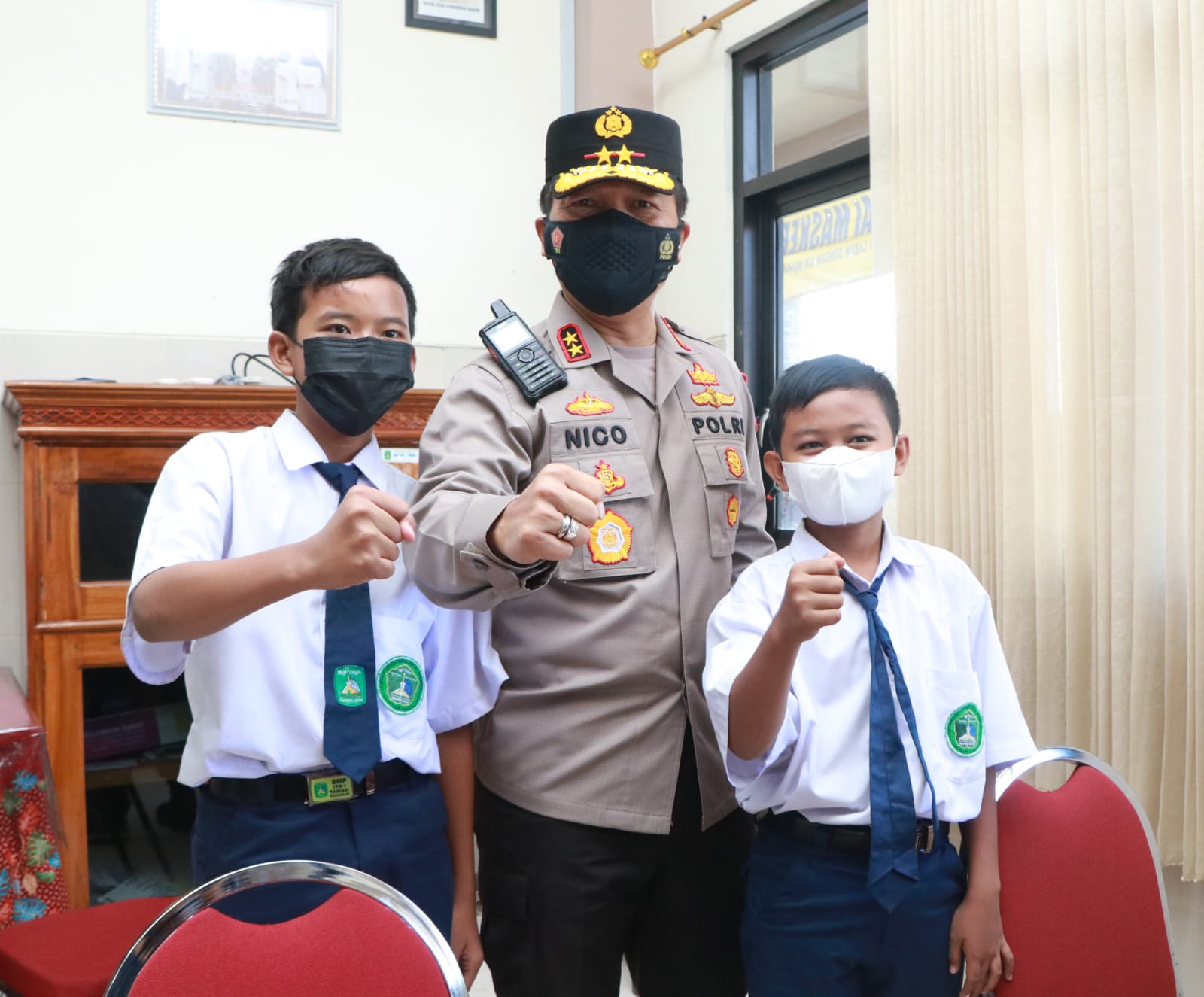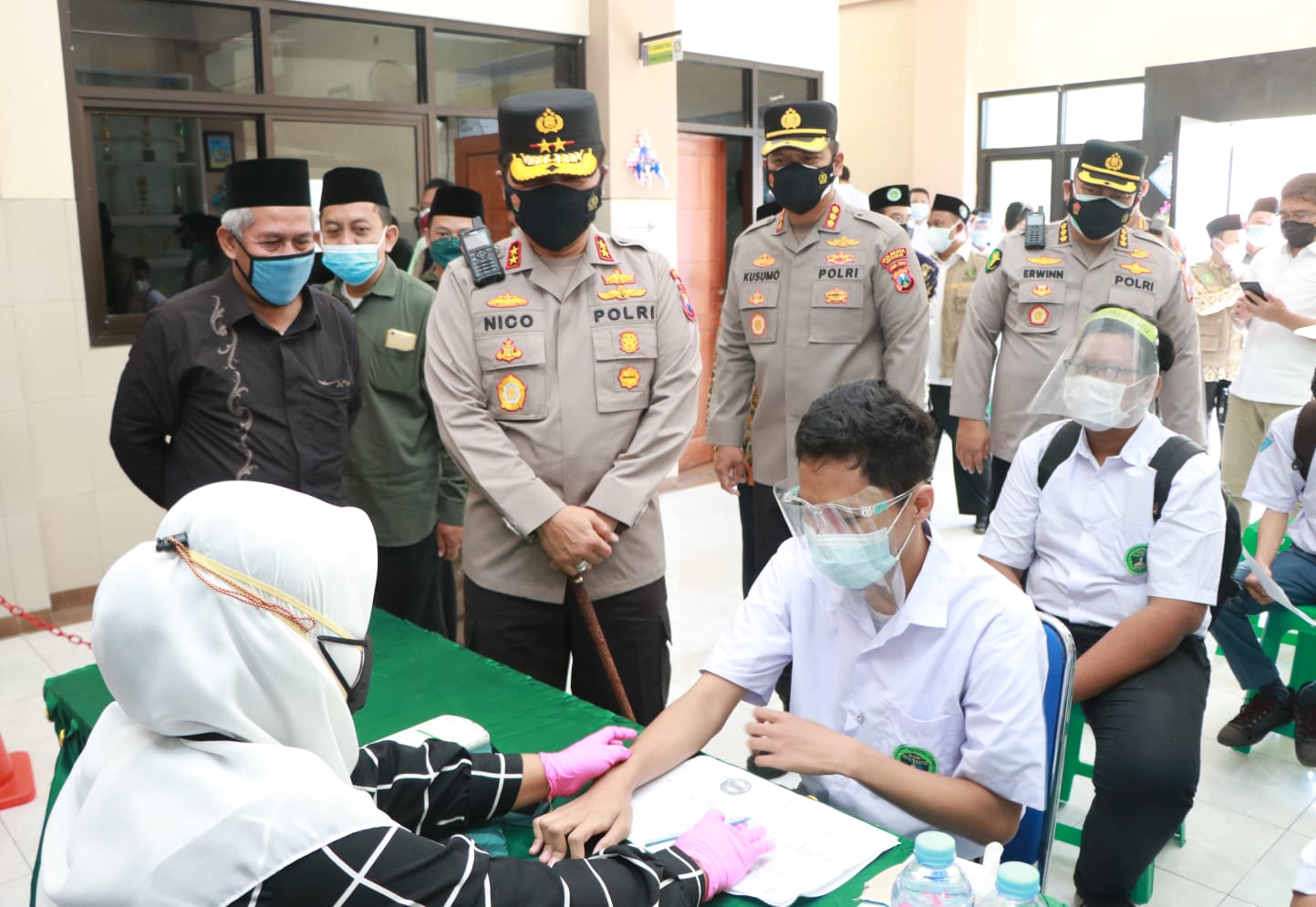 Kapolda Jawa Timur Irjen Pol Nico Afinta didampingi Ketua Pengurus Wilayah Nahdlatul Ulama (PWNU) Jatim, KH. Marzuki Mustamar dan Rois Syuriah PWNU Jatim KH.Anwar Manshur bersama Pejabat Utama Polda Jatim serta Kapolres Sidoarjo, melakukan pengecekan vaksinasi di kalangan pelajar dan Santri di kabupaten Sidoarjo, pada Selasa (14/9/2021). Hal ini sebagai bentuk dukungan kepada pemerintah, guna terwujudnya herd immunity di Jawa Timur.