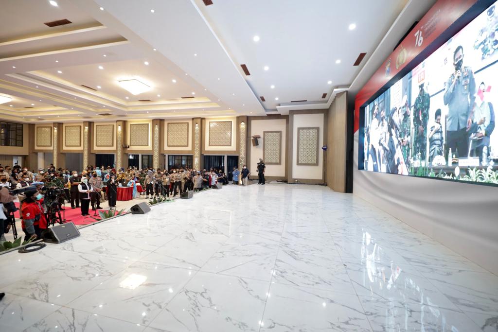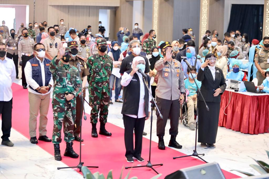 Forkopimda Jawa Timur Gubernur Jatim, Pangdam V Brawijaya, Pangkoarmada II, Kapolda Jatim, Kajati Jawa Timur, Kalanti Jawa Timur, Kabinda Jawa timur, Wakil Ketua DPRD Jawa timur, Sekda Prov serta didampingi Pejabat Utama Polda Jatim dan Pejabat Utama Kodam V Brawijaya Selasa (10/8/2021) pagi mengecek Vaksinasi Merdeka Semeru yang diselenggarakan di Gedung Mahameru, Mapolda Jatim.