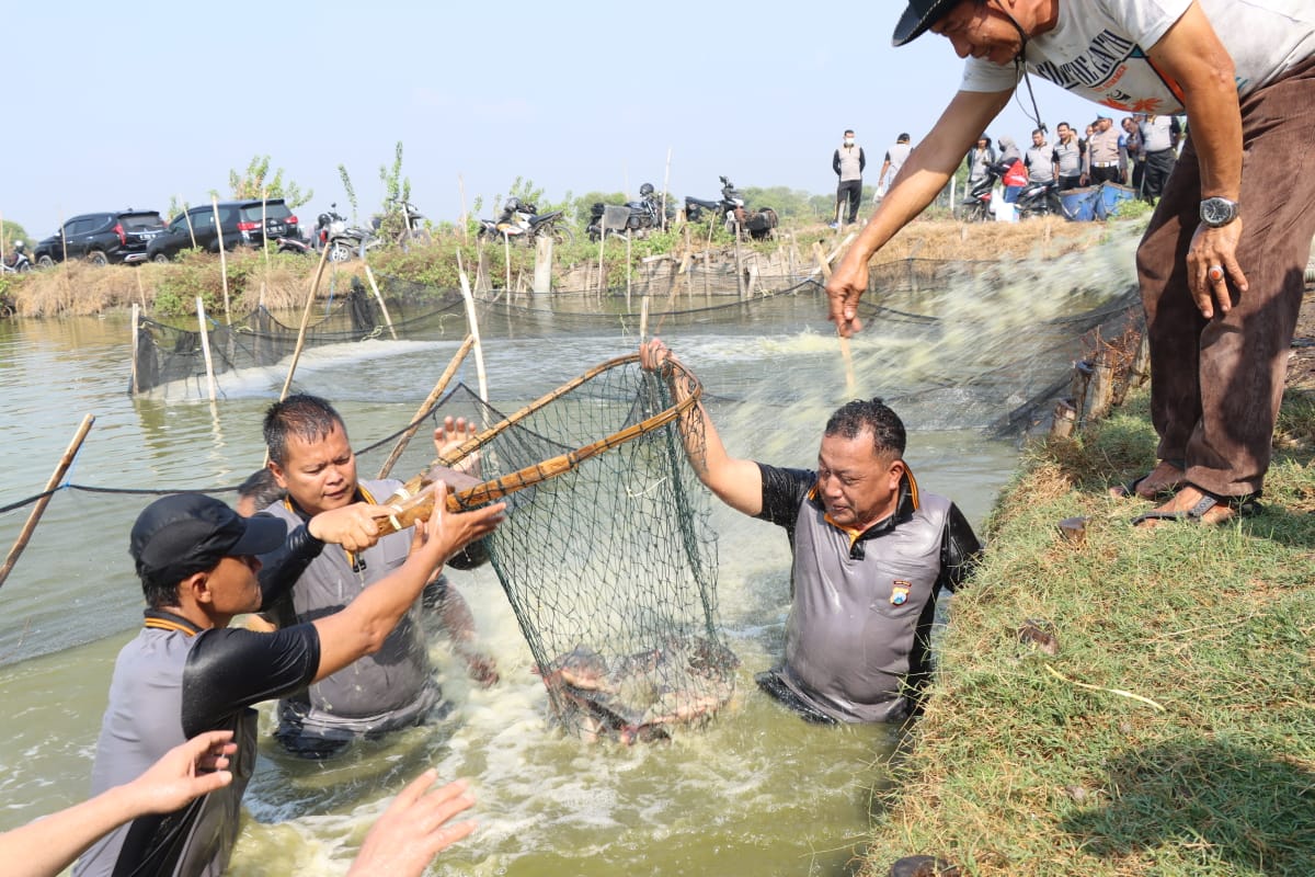 Selain itu, melalui kegiatan panen raya di Tambak Banjarpanji, Kapolresta Sidoarjo Kombes. Pol. Kusumo Wahyu Bintoro didampingi Wakapolresta Sidoarjo AKBP Deny Agung Andriana beserta pejabat utama dan anggota ikut langsung menjaring ikan di dalam kolam tambak.