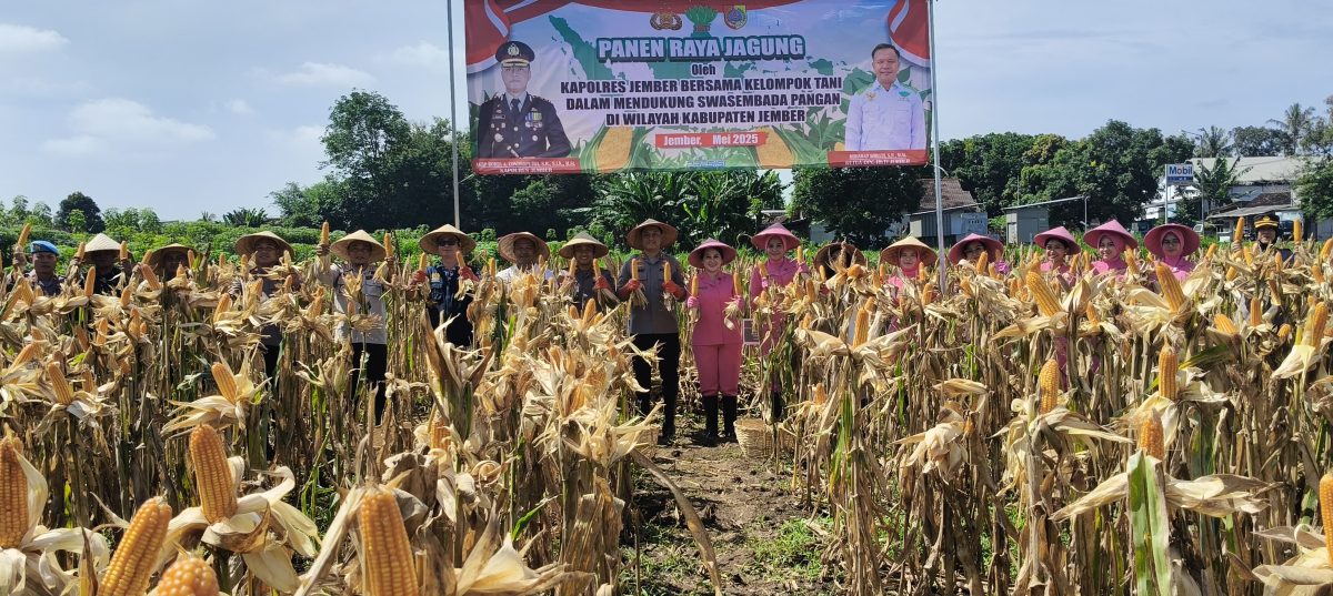 “pada hari ini kami melaksanakan penanaman dan panen Jagung di Desa Lojejer Kecamatan Wuluhan Kabupaten Jember seluas satu hektare,dimana lahan yang kita kelola bekerjasama dengan kelompok tani dan petani yang ada di kabupaten Jember ini ada total delapan ratus tujuh koma lima hektare yang terbagi ada tiga belas kecamatan”tutur Kapolres Jember