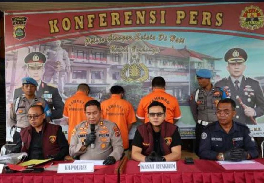 iga orang tersangka yang berhasil ditangkap oleh petugas kepolisian ini adalah berinisial I-K-I (27) dan I-M-T-Y (29) asal Kecamatan Blahbatuh dan I-P-S (27) asal Kecamatan Abiansemal, ketiga orang tersangka ini langsung dihadirkan dalam konferensi pers yang dilaksanakan di Lobby Mapolres Gianyar, Kamis (23/1/2025) pagi.
