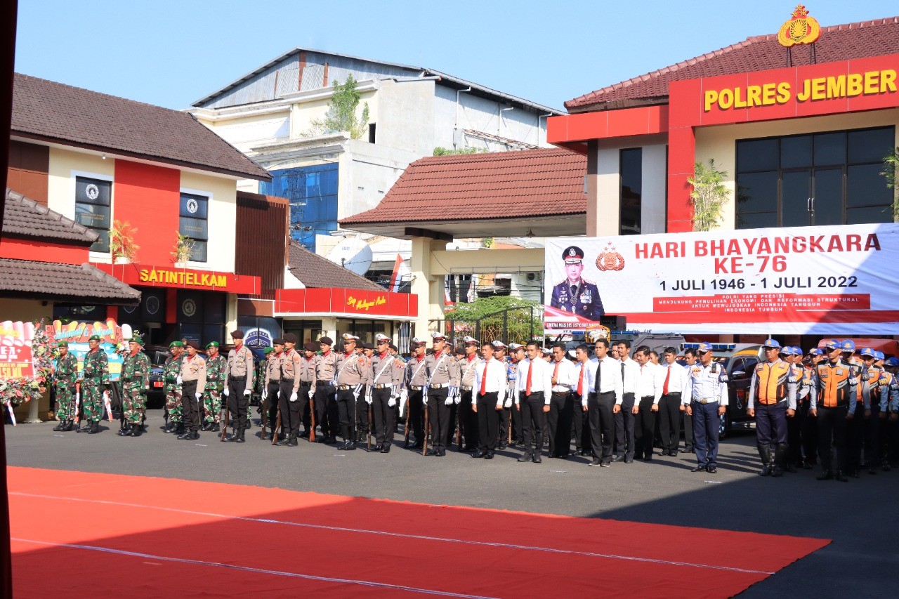 Tak lupa pula Polres Jember mengikuti upacara HUT BHAYANGKARA ke – 76 yang digelar secara Nasional dan bertemakan “Polri yang presisi mendukung pemulihan ekonomi dan reformasi struktural untuk mewujudkan Indonesia tangguh Indonesia tumbuh.”
