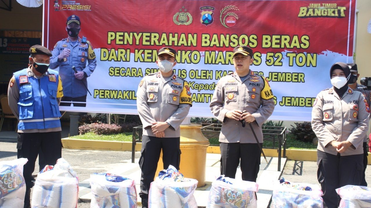 Untuk membantu warga golongan ekonomi lemah yang tinggal di seluruh wilayah pedesaan yang tersebar di Kabupaten Jember, Polres Jember membagikan beras hingga sembako. Sasaran penerima bantuan sosial (bansos) ini adalah masyarakat kurang mampu seperti petani/pekebun, janda, lansia, pelaku usaha perekonomian desa.
