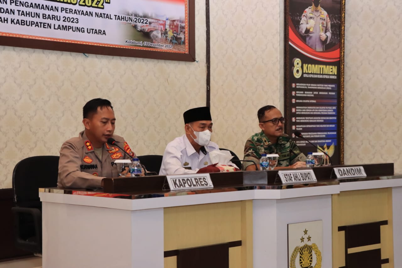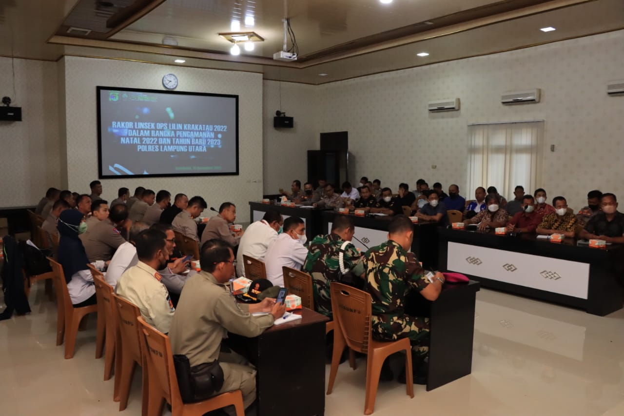 Jelang Natal 2022 dan Tahun Baru 2023 (NATARU), Polres Lampung Utara Polda Lampung menggelar rapat koordinasi lintas sektoral Operasi Lilin Krakatau 2022 bersama stakeholder dalam rangka pengamanan NATARU yang akan dilaksanakan mulai tanggal 23 Desember 2022 sampai dengan 2 Januari 2023 mendatang, bertempat di ruang Rekonfu Mapolres setempat pada Kamis (15/12/2022)