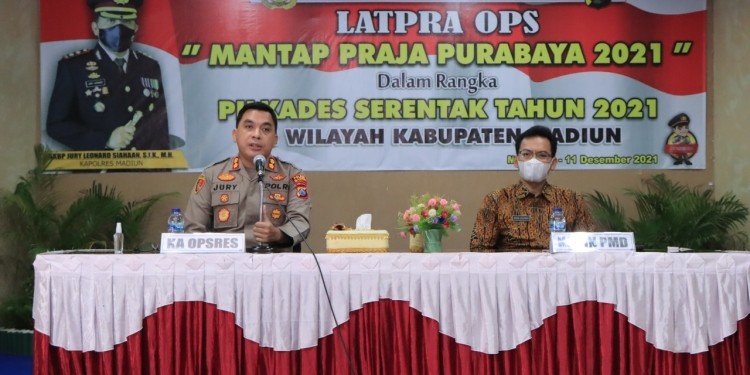 Menjelang pelaksanaan Pemilihan Kepala Desa (Pilkades) serentak 2021, Kapolres Madiun AKBP Jury Leonard Siahaan, S.I.K., M.H. membuka Latihan Pra Operasi Mantap Praja Purabaya tahun 2021 bertempat di Gedung Bhayangkara Polres Madiun, Jumat (10/12/2021).