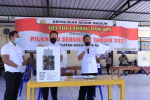 Setelah Pelaksanaan Lat Pra Ops Mantap Praja Purabaya th 2021 dilanjutkan dengan kegiatan Geladi Lapang Simulasi Pengamanan TPS Pilkades Serentak Kabupaten Madiun tahun 2021 di Tribun Sat Lantas Polres Madiun yang disaksikan seluruh anggota Polres Madiun. (Mrsd/Bud)