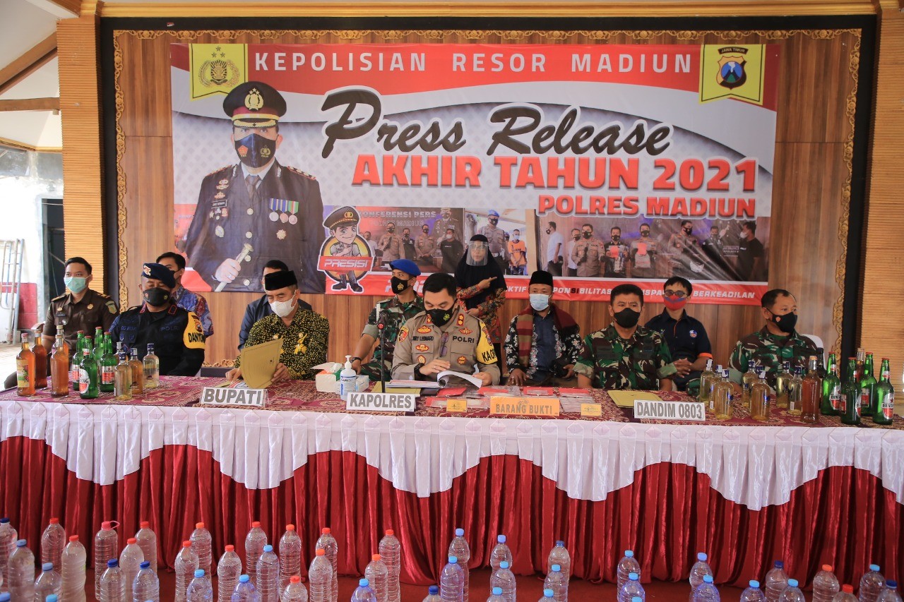 Menjelang tutupnya tahun 2021, Kepolisian Resort Madiun menggelar Press Release dan pemusnahan barang bukti. Agenda tersebut dipimpin langsung oleh kapolres madiun AKBP Jury Leonard Siahaan. Hadir dalam kegiatan, Wabup Madiun Hari Wuryanto bersama jajaran Forkopimda Kabupaten Madiun, Kamis 30/12/2021.