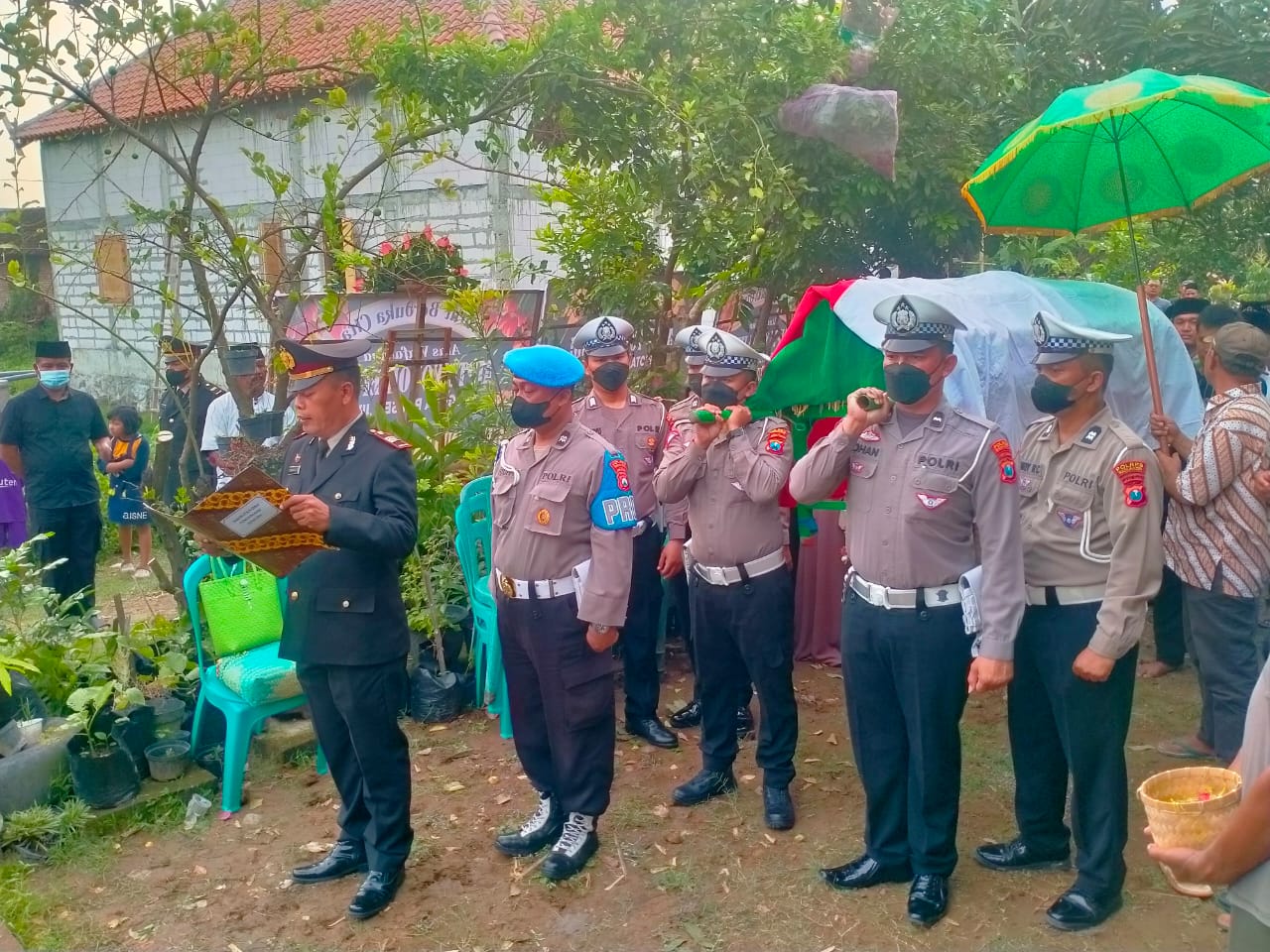 Upacara pemakaman diawali dengan Laporan perwira upacara kemudian dilanjutkan dengan pembacaan riwayat hidup singkat almarhum. Almarhum menjabat sebagai anggota Bhabinkamtibmas Desa Grobogan Polsek Jiwan.