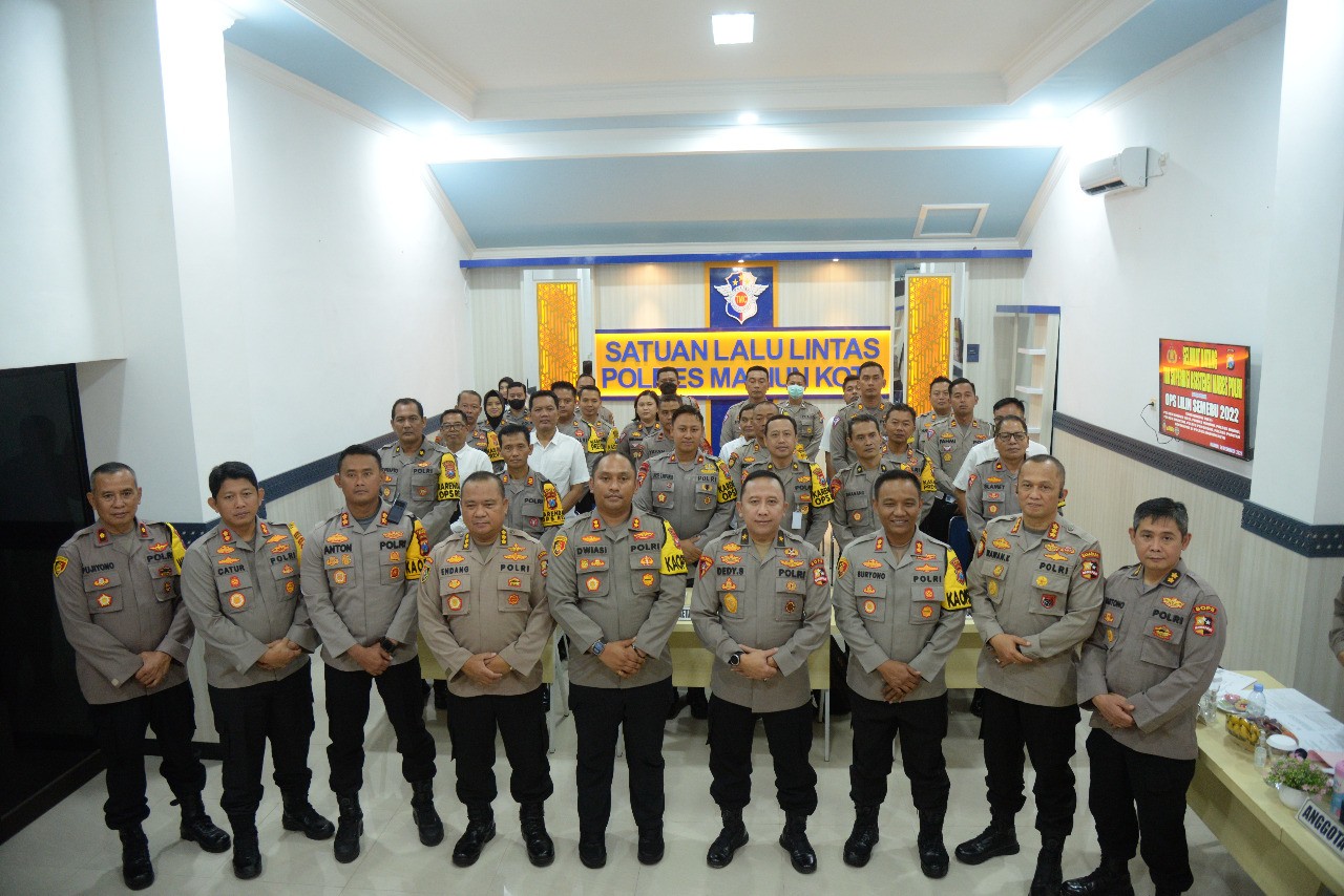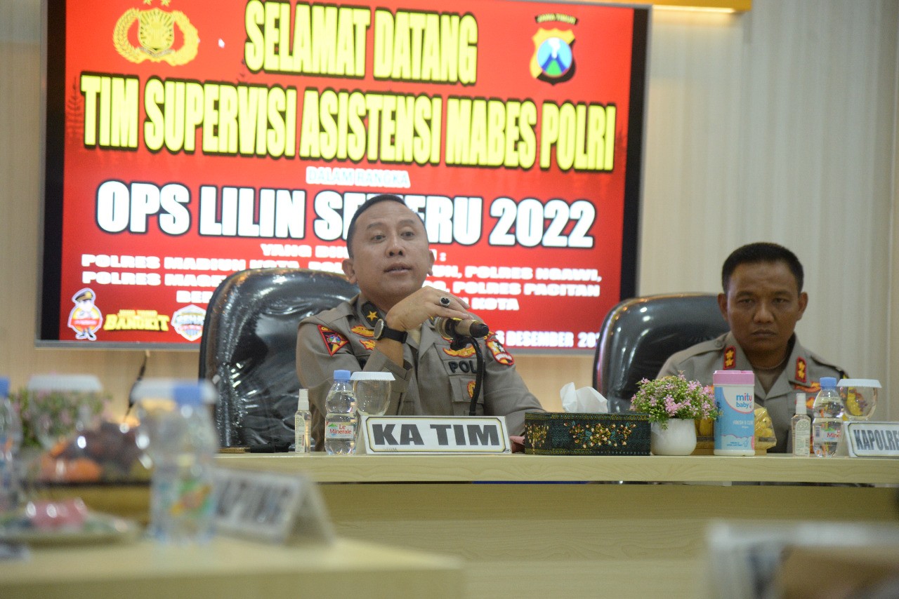 Kapolres Madiun Kota AKBP Suryono., SH., SIK., MH. bersama Kapolres jajaran Korwil V menerima kunjungan supervisi dan asistensi dari Asops Mabes Polri yang dipimpin Brigjend Pol Drs. Dedi Setiya Budi selalu Ketua Tim yang bertempat di Ruang TMC Satuan Lalu Lintas Polres Madiun Kota, Jalan Sumatera Kota Madiun, Senin (26/12/2022).