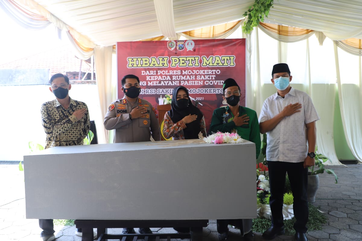 Kapolres Mojokerto AKBP Dony Alexander, S.I.K., M.H. secara simbolis menyerahkan bantuan peti jenazah dari Polres Mojokerto kepada Rumah Sakit yang melayani Pasien Covid-19 di wilayah Kabupaten Mojokerto. Kegiatan ini bertempat di RSI Sakinah Kecamatan Sooko Kabupaten Mojokerto, Kamis (26/08).
