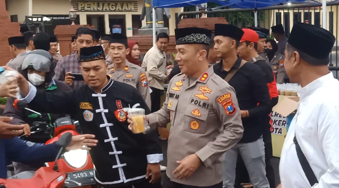 Polres Mojokerto Kota mengelar acara bagi-bagi ta’jil untuk masyarakat umum dan buka puasa bersama dengan Ikatan Pencak Silat Indonesia (IPSI) Cabang Kota Mojokerto dan Kodim 0815 Mojokert, Kamis(30/3/2023)