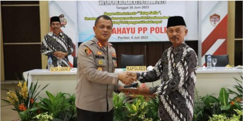 Polres Pacitan melalui Bagian Sumber Daya Manusia (SDM), menyelenggarakan kegiatan Tasyakuran PP Polri ke 24 tahun 2023 di Gedung Graha Polres Pacitan, kegiatan kali ini dilaksanakan dengan tema dan dilandasi motto “tetap setia” persatuan keluarga besar purnawirawan Polri komitmen dan konsisten mendukung Polri yang Presisi untuk Negeri pada hari Kamis (6/7/2023).
