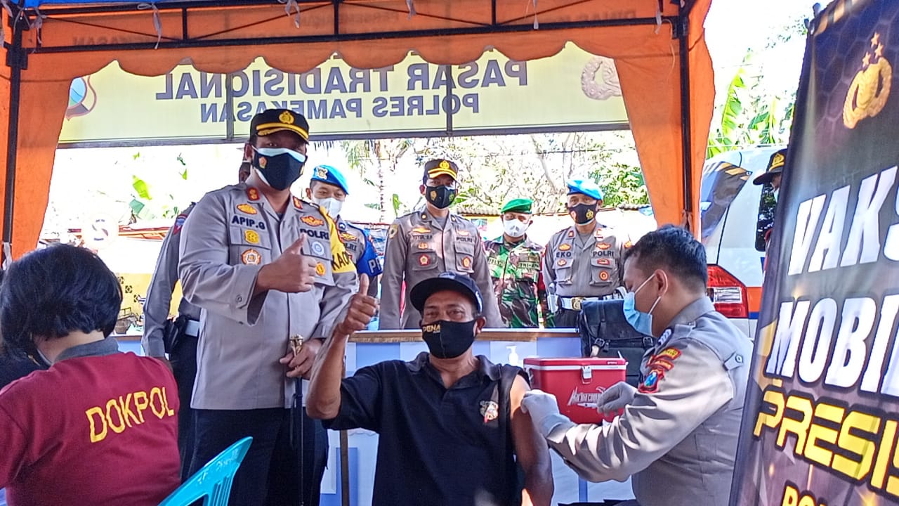 Pada kesempatan tersebut Kapolres Pamekasan AKBP Apip Ginanjar, S.I.K., M.Si bersama PJU Polres Pamekasan tinjau langsung giat Vaksinasi Mobile Presisi di Pasar Kolpajung yang dilakukan oleh Urkes Polres Pamekasan.( Humas )