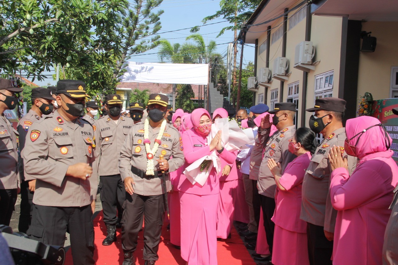 Sebelum memasuki Mapolres Sampang, AKBP Arman S.IK, M.Si beserta Ketua Bhayangkari Cabang Sampang mendapatkan kalungan bunga dan buket bunga dari siswa TK Kemala Bhayangkari 80 Sampang.