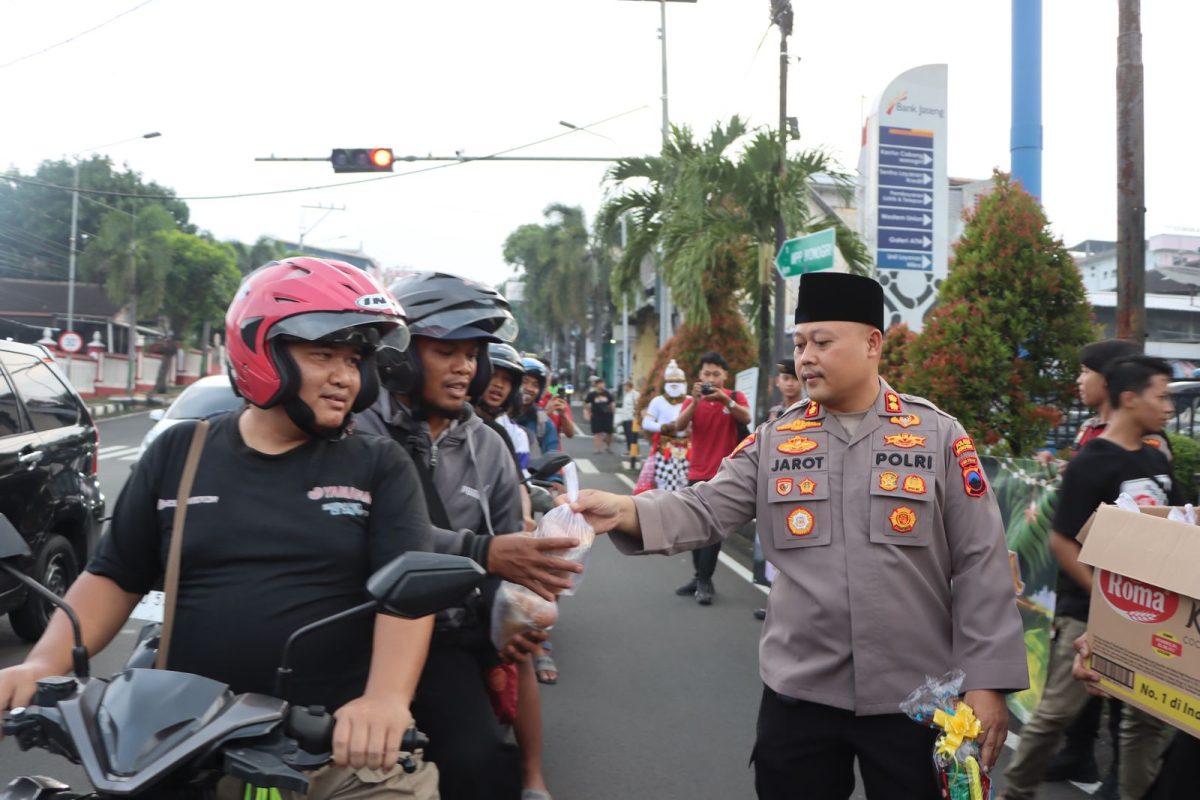 Polres Wonogiri manfaatkan momen bulan Ramadan untuk bagi takjil dan makanan berbuka puasa kepada pengguna jalan. Aksi sosial di simpang 4 Ponten Wonogiri ini dipimpin langsung Kapolres Wonogiri AKBP Jarot Sungkowo, S.H., S.I.K., pada Rabu petang (5/3/2025).