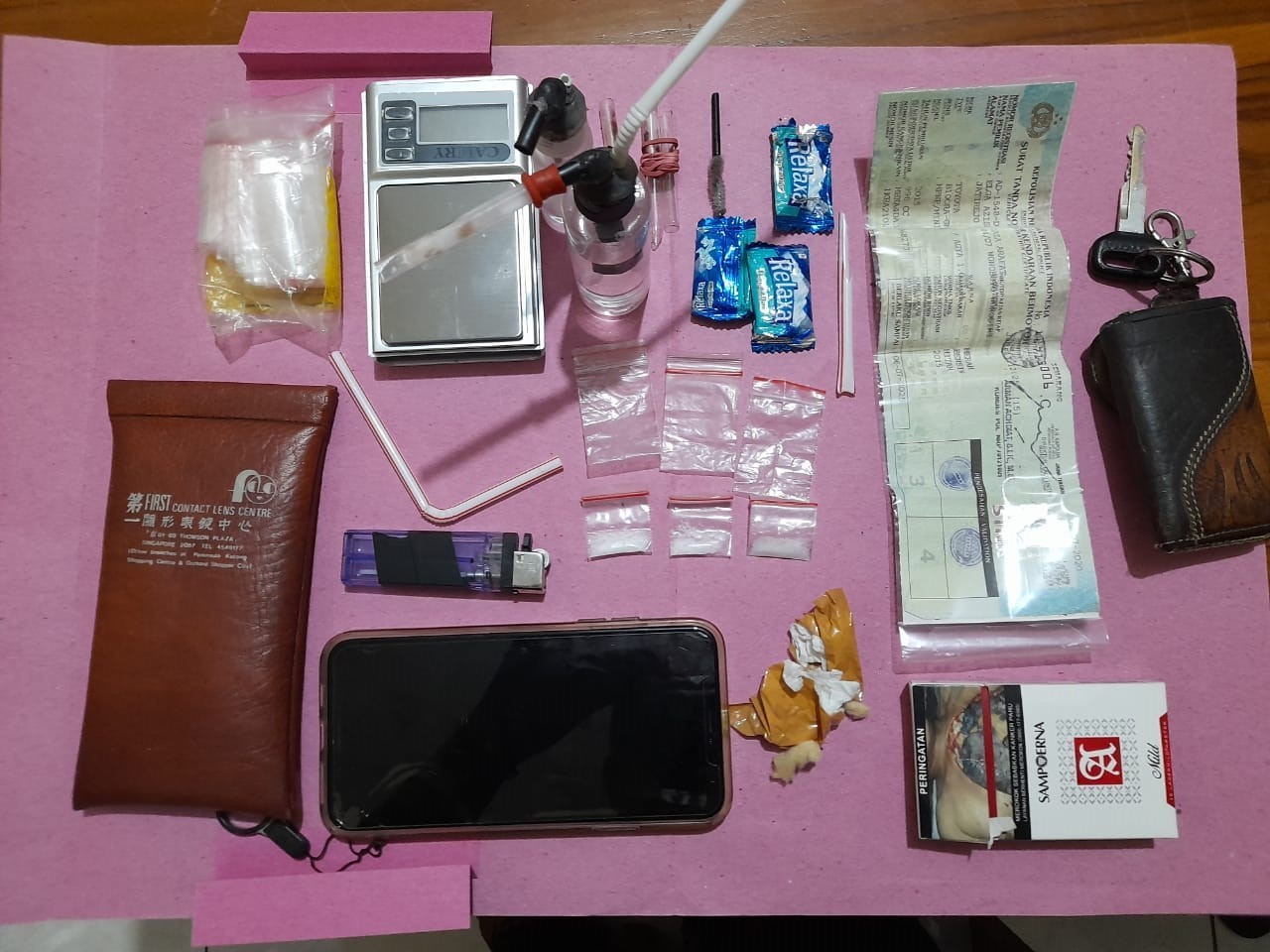 Selain itu, tambah AKBP Dydit, ditemukan pula 1 korek api, 1 pack plastik kecil, dan 3 plastik kecil yang diduga bekas wadah sabu-sabu. Polisi turut mengamankan 1 dompet berwarna coklat merek First, 2 handphone merek Iphone XS MAX warna hitam, serta 1 unit mobil AGYA merah.