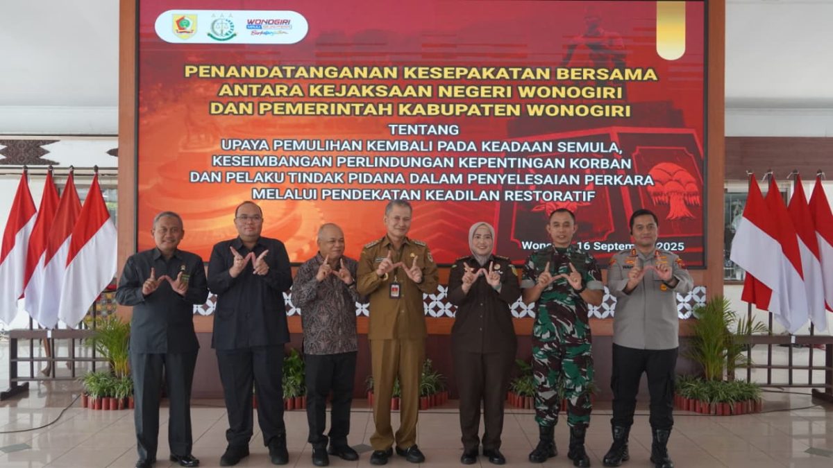 Upaya mewujudkan penegakan hukum yang lebih humanis dan berorientasi pada pemulihan diwujudkan melalui penandatanganan kesepakatan bersama antara Pemerintah Kabupaten Wonogiri dan Kejaksaan Negeri Wonogiri, Selasa (16/9/2025) di Pendopo Kabupaten Wonogiri.