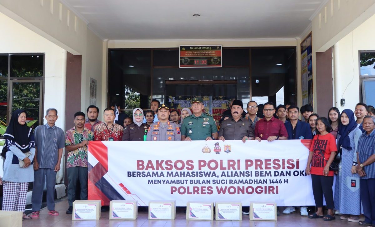 Pererat sinergi dengan aliansi mahasiswa dan masyarakat, Polres Wonogiri menggelar kegiatan bakti sosial (Baksos) Polri Presisi, guna menyambut bulan suci Ramadhan 1446 H. Kamis (27/2/2025).