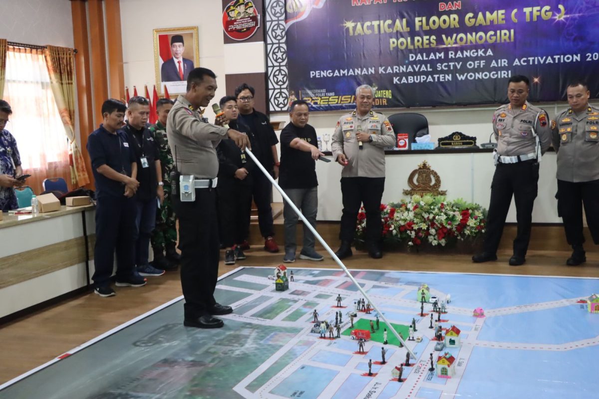 Polres Wonogiri menggelar rapat Koordinasi (Rakor) pengamanan dan simulasi Tactical Floor Game (TFG) di Aula sanika satyawada Polres Wonogiri dalam rangka kesiapan pengamanan acara Karnaval SCTV, Jumat (21/6/2024).