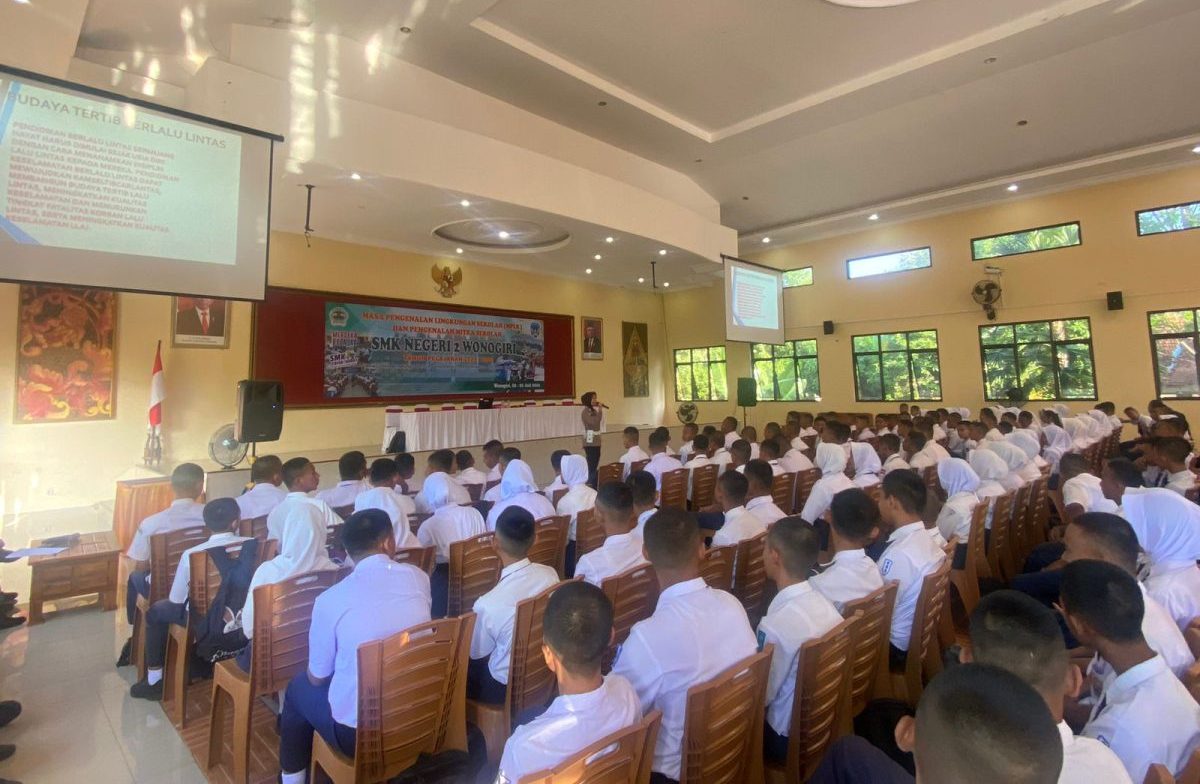 Sat Lantas Polres Wonogiri sosialisasi Ops Patuh terkait tertib belalulintas kepada para pelajar di SMKN 2 Wonogiri, Selasa (23/7/2024) pagi.