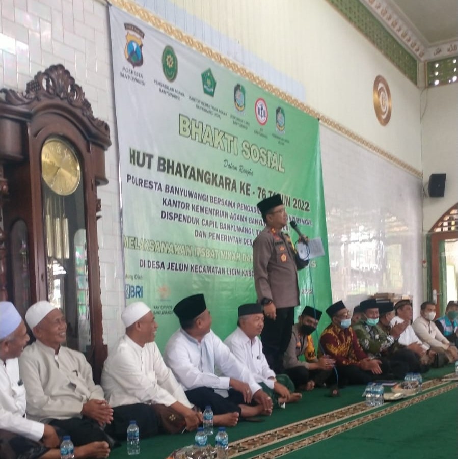 Dalam rangkaian HUT Bhayangkara ke-76, Polresta Banyuwangi terus menebar kebaikan. Pada Jumat, (24/6/2022), Polresta Banyuwangi bekerjasama dengan Pengadilan Agama (PA) Banyuwangi serta Dinas Kependudukan dan Pencatatan Sipil (Dispendukcapil) Banyuwangi, menggelar isbat nikah masal dan pengobatan gratis di Desa Jelun, Kecamatan Licin.