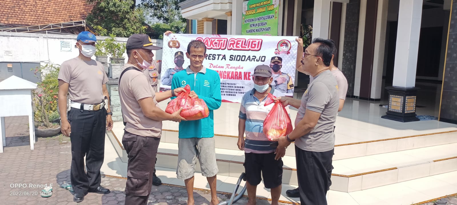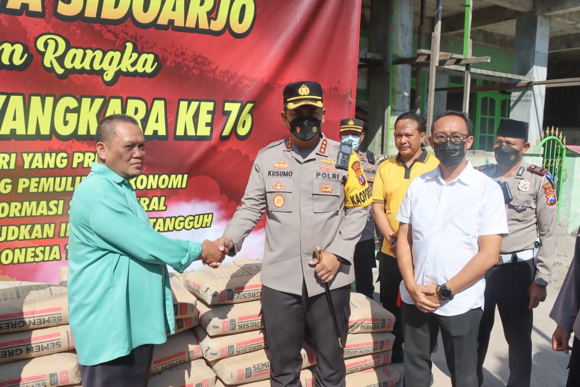 Kapolresta Sidoarjo Kombes Pol. Kusumo Wahyu Bintoro, Senin (20/6/2022), di lokasi baksos religi Masjid Baitussalam, Dusun Kepuhsari, Desa Prasung, Kecamatan Buduran, mengatakan dalam rangka Hari Bhayangkara ke-76 pihaknya melaksanakan kegiatan kerja bakti bersih tempat ibadah, serta berikan bantuan bahan bangunan maupun perlengkapan ibadah di sejumlah tempat ibadah.
