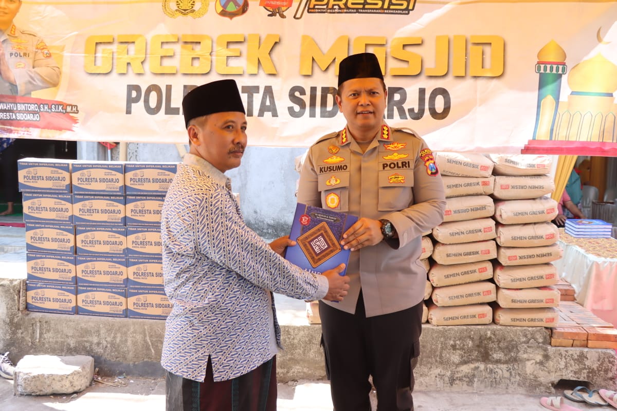 Melalui program Grebek Masjid Polresta Sidoarjo, setiap Jumat mendatangi masjid atau mushola yang sedang melakukan renovasi. Sejumlah bahan bangunan yang diserahkan, kitab Al Qur’an, air mineral, semen hingga paket sembako dibagikan.