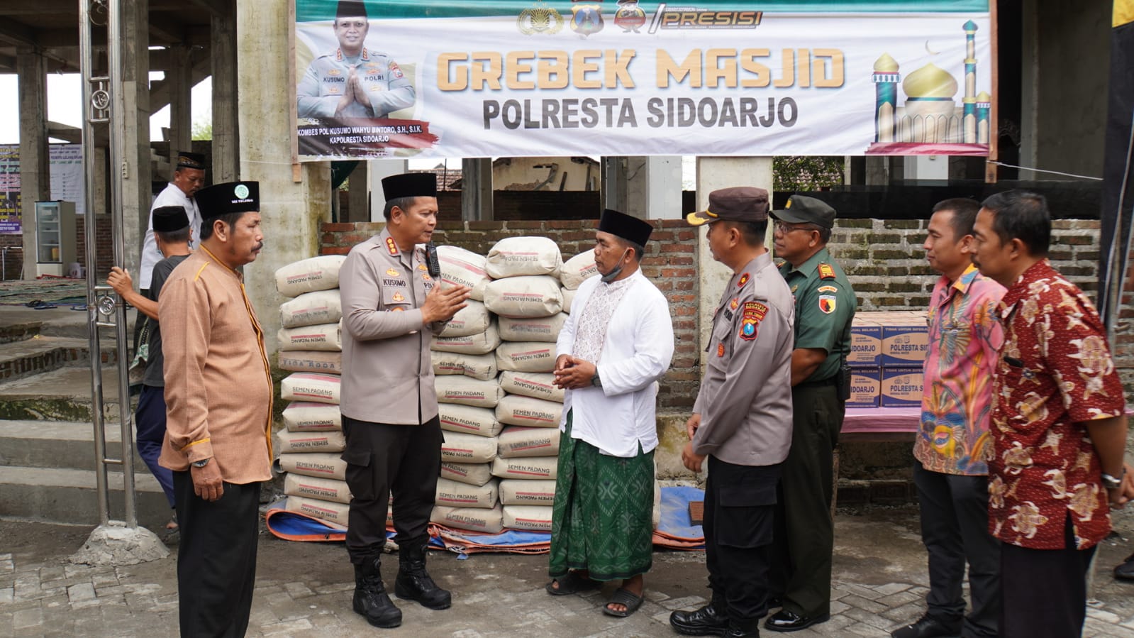 “Di bulan Ramadhan ini, kami ingin berbagi dan membangun rasa peduli anggota kepada tempat ibadah maupun masyarakat. Salah satunya ada masjid yang sedang membangun atau renovasi, kami tindaklanjuti melalui program Gerebek Masjid untuk berikan bantuan material,” jelas Kapolresta Sidoarjo Kombes Pol. Kusumo Wahyu Bintoro.