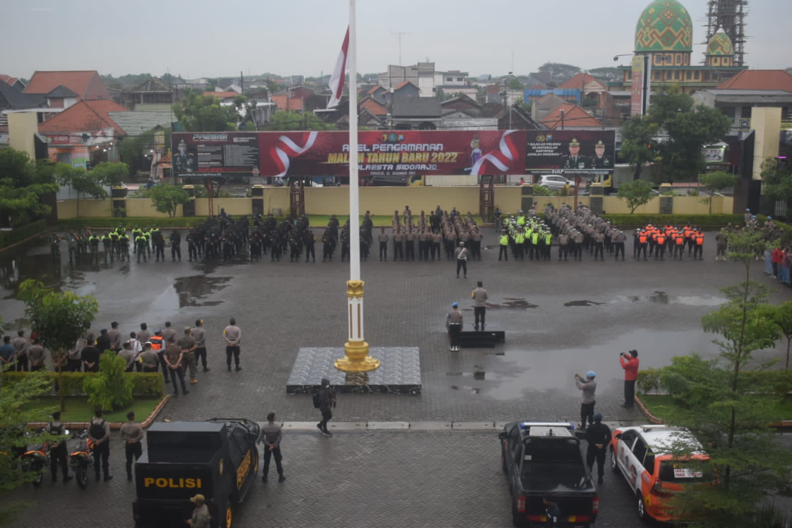Kapolresta Sidoarjo Kombes Pol. Kusumo Wahyu Bintoro, pada Apel Pengamanan Malam Tahun Baru 2022 di Mapolresta Sidoarjo, Jumat (31/12/2021), menyampaikan agar para personel yang bertugas melakukan tugas sebaik mungkin di penghujung tahun ini.