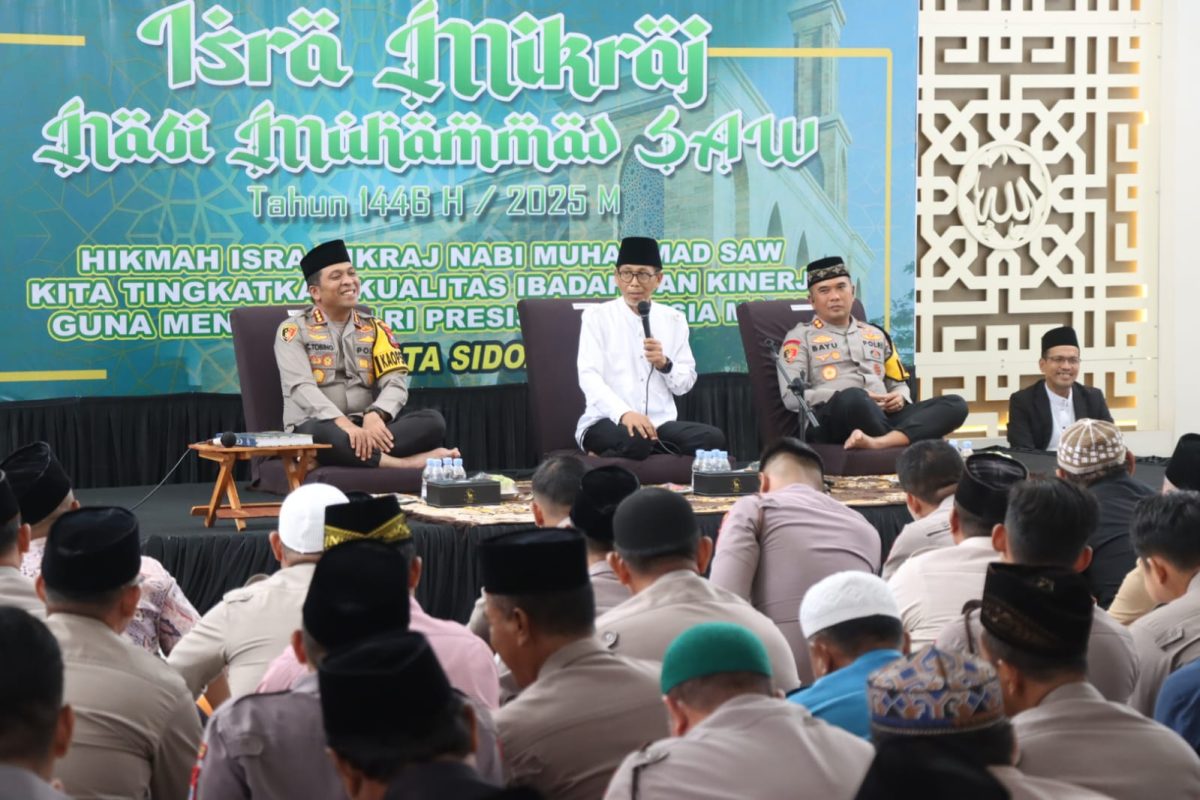 Peringati Isra Mi’raj Nabi Muhammad SAW, Polresta Sidoarjo mengadakan pembacaan Shalawat Nabi, pembacaan Al Qur’an dan pengajian yang di isi Prof. Dr. H. M. Ali Aziz, pada Kamis (6/2/2025) di Masjid Al Ikhlas Polresta Sidoarjo.
